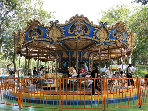 24座豪華轉(zhuǎn)馬中央有起伏奔跑的大小馬群。設(shè)備啟動后,金光銀光,閃閃相映,馬群、馬車競相賽跑,形成一個萬馬奔騰的場面,乘客如同參加一場跑馬比賽,無不感到心曠神怡,樂趣無窮!